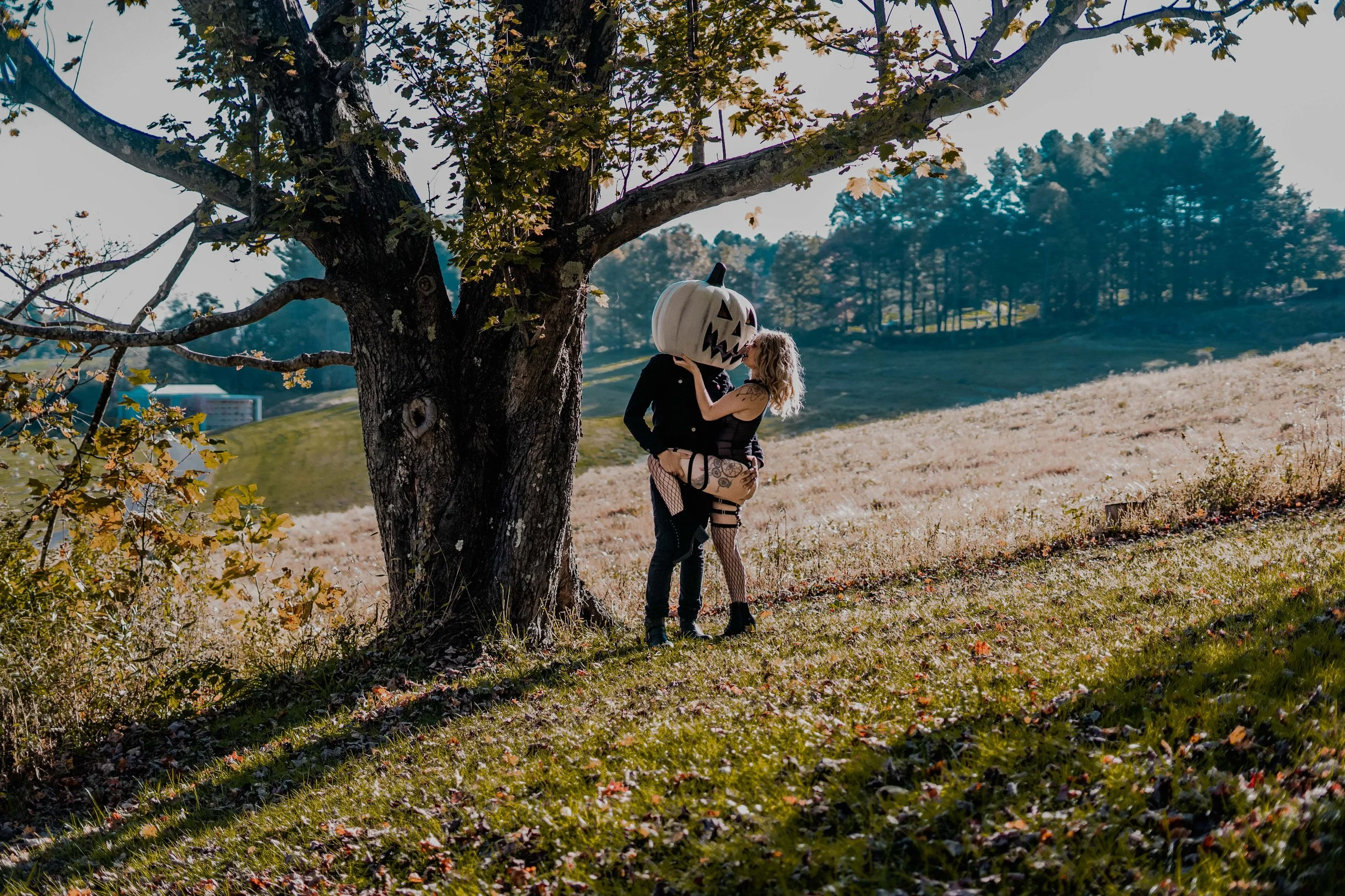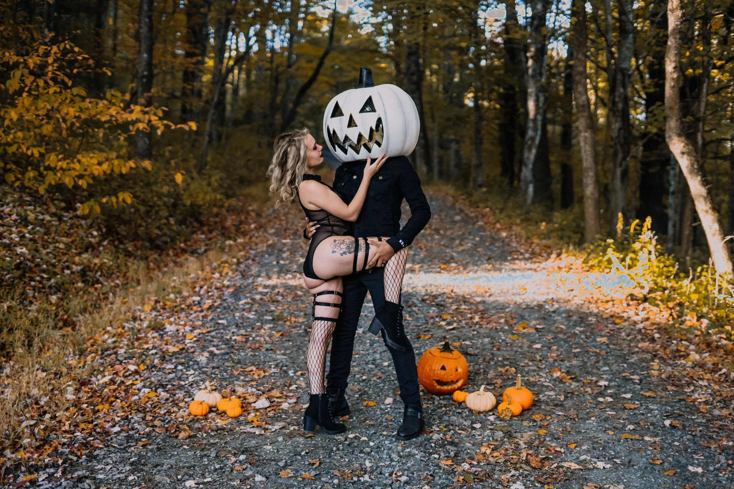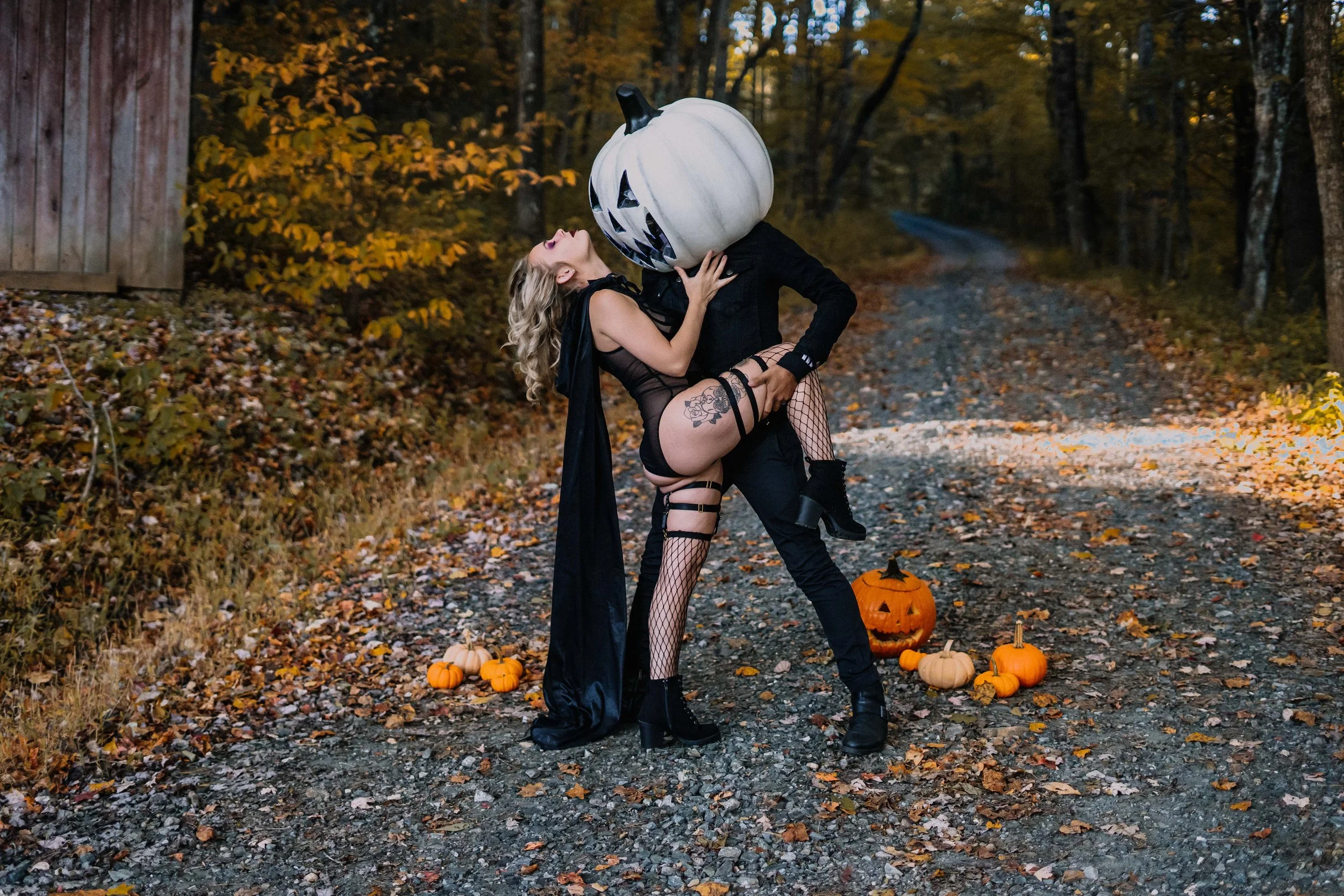 As the leaves change and fall sets in here in north carolina, outdoor boudoir is one of my favorite things to photograph with my clients and even more so when it becomers a halloween couples boudoir session featuring pumpkin heads and cloaks.