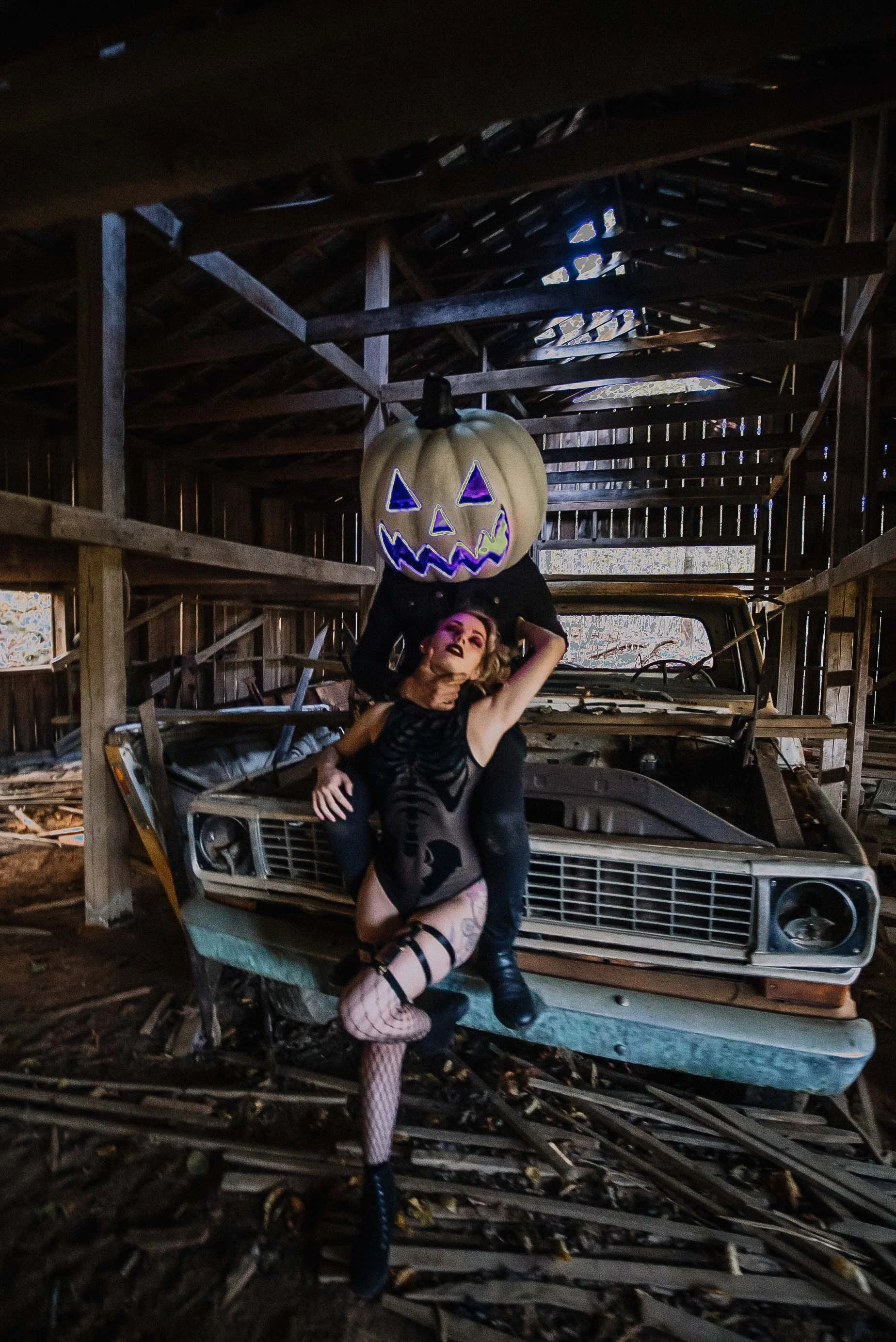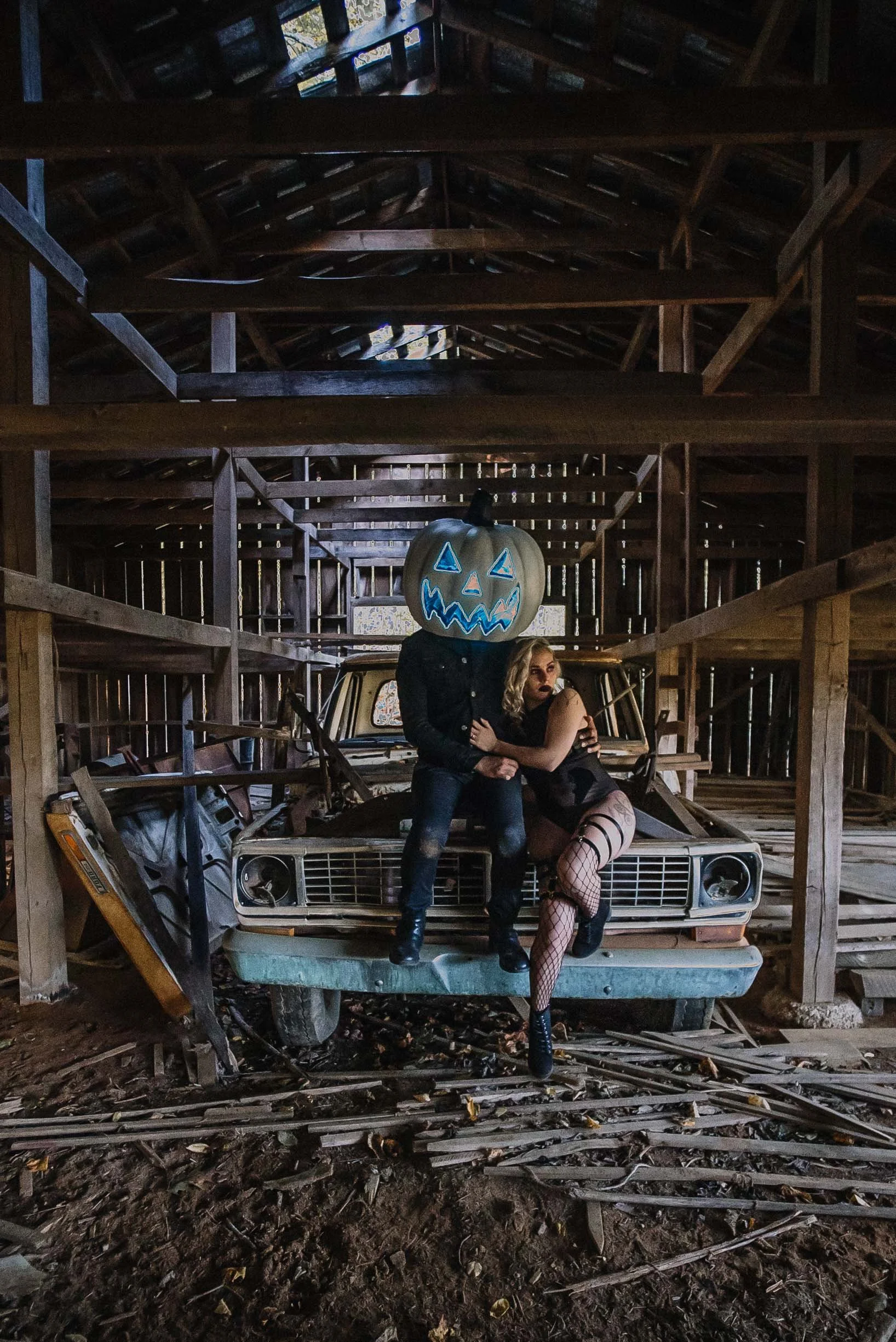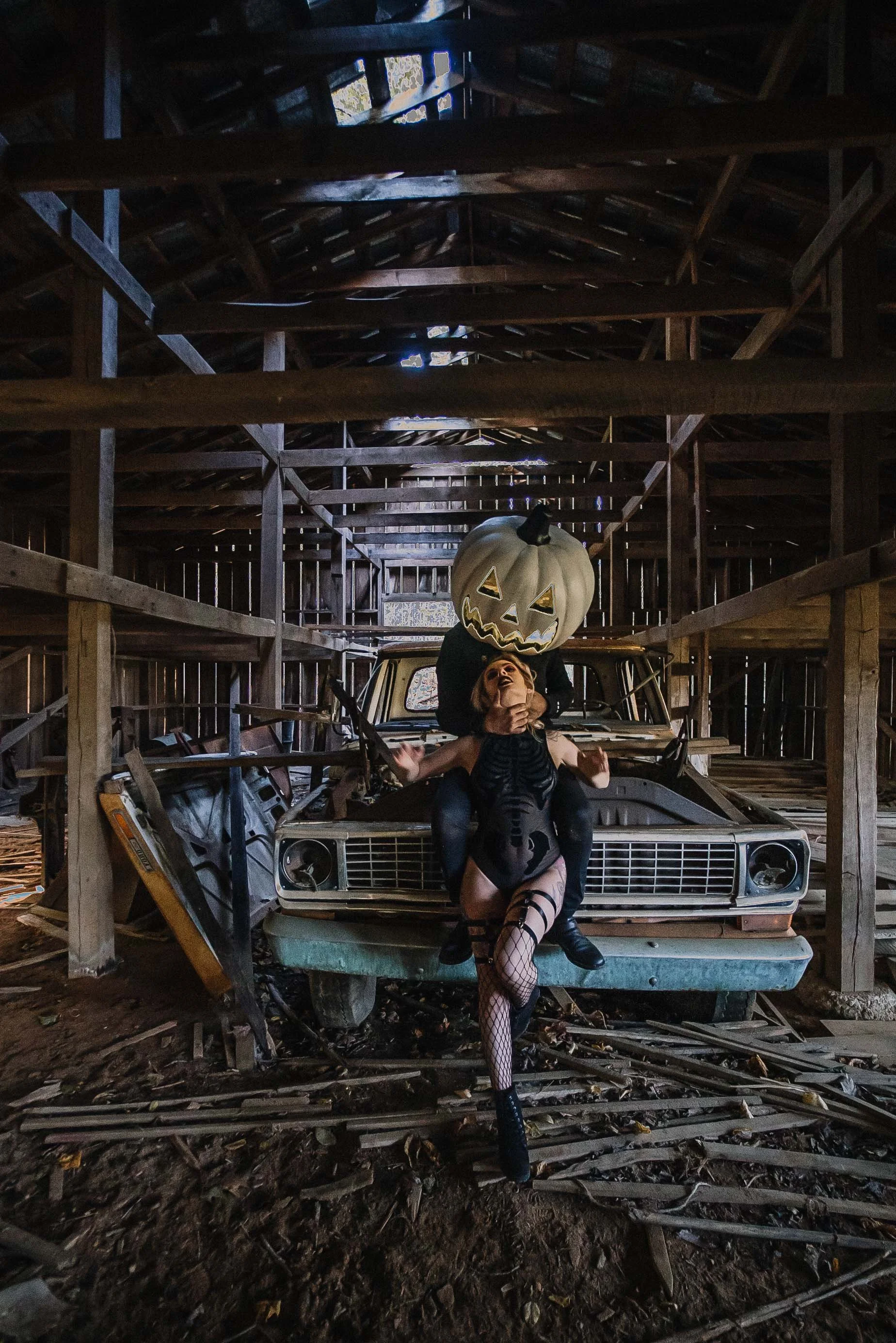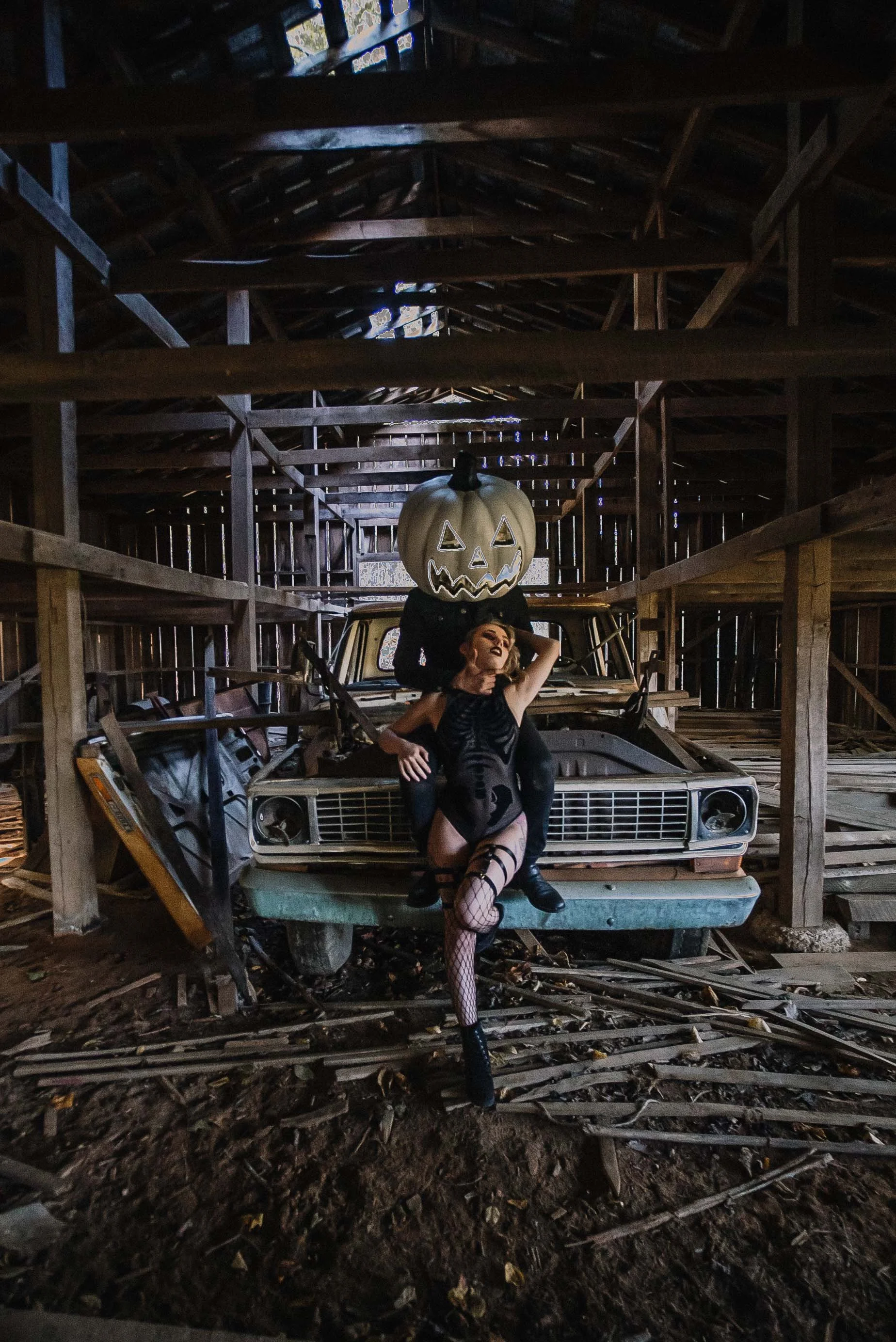 this couple completely pulled through on this session, the connection the spooky sexy vibes and daring looks just made the session so much fun + artistic. They were down to go through barns and pose on old vehicles lay in the grass and get dirty all for the best sexy boudoir halloween photos.